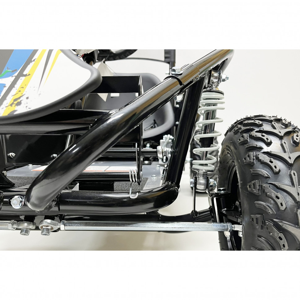 Благодаря цепной передаче на заднюю ось, багги обеспечивает отличную маневренность и проходимость, позволяя легко справляться с различными препятствиями на пути. Это делает его идеальным для использования в парках, на дачах и в лесных зонах.