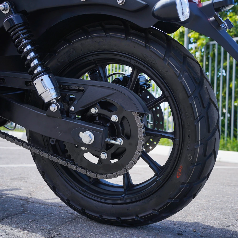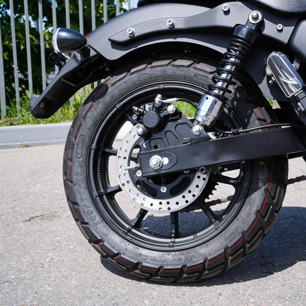 С весом 195 кг и габаритами 2210*780*1130 мм, этот электромотоцикл сочетает в себе стабильность и маневренность. Диаметр колес: переднее 19" и заднее 16" обеспечивают отличную проходимость и комфорт при движении по различным дорожным покрытиям.