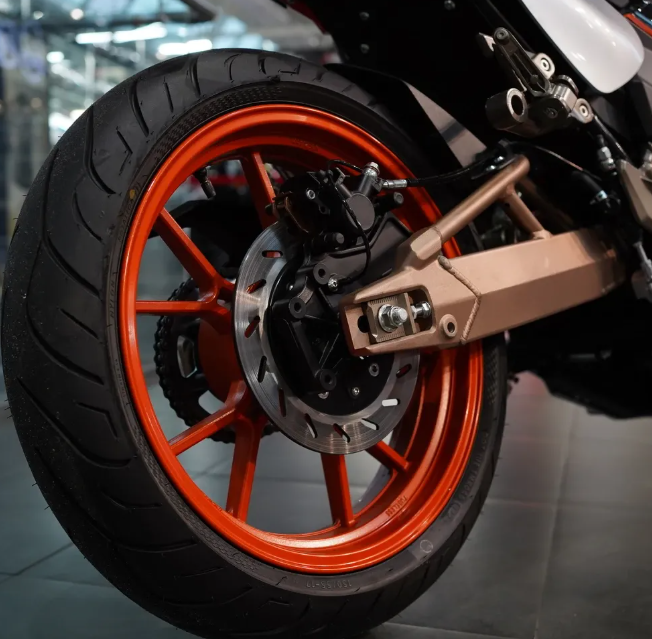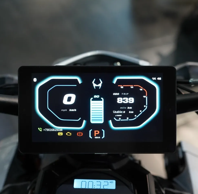 Тормозная эффективность дополняется качественной ходовой частью. Конфигурация колес с широкой задней шиной 150/55-17 и передней 110/70-17 на литых дисках обеспечивает отличное сцепление с дорогой и уверенное прохождение поворотов. Полноценная мотоциклетная подвеска (вилка спереди и моноамортизатор сзади) эффективно гасит неровности, обеспечивая комфорт и постоянный контакт колес с покрытием. Информация о скорости, заряде батареи, выбранном режиме езды и пробеге выводится на четкий цифровой TFT-дисплей, что позволяет всегда оставаться в курсе состояния байка, не отвлекаясь от дороги.