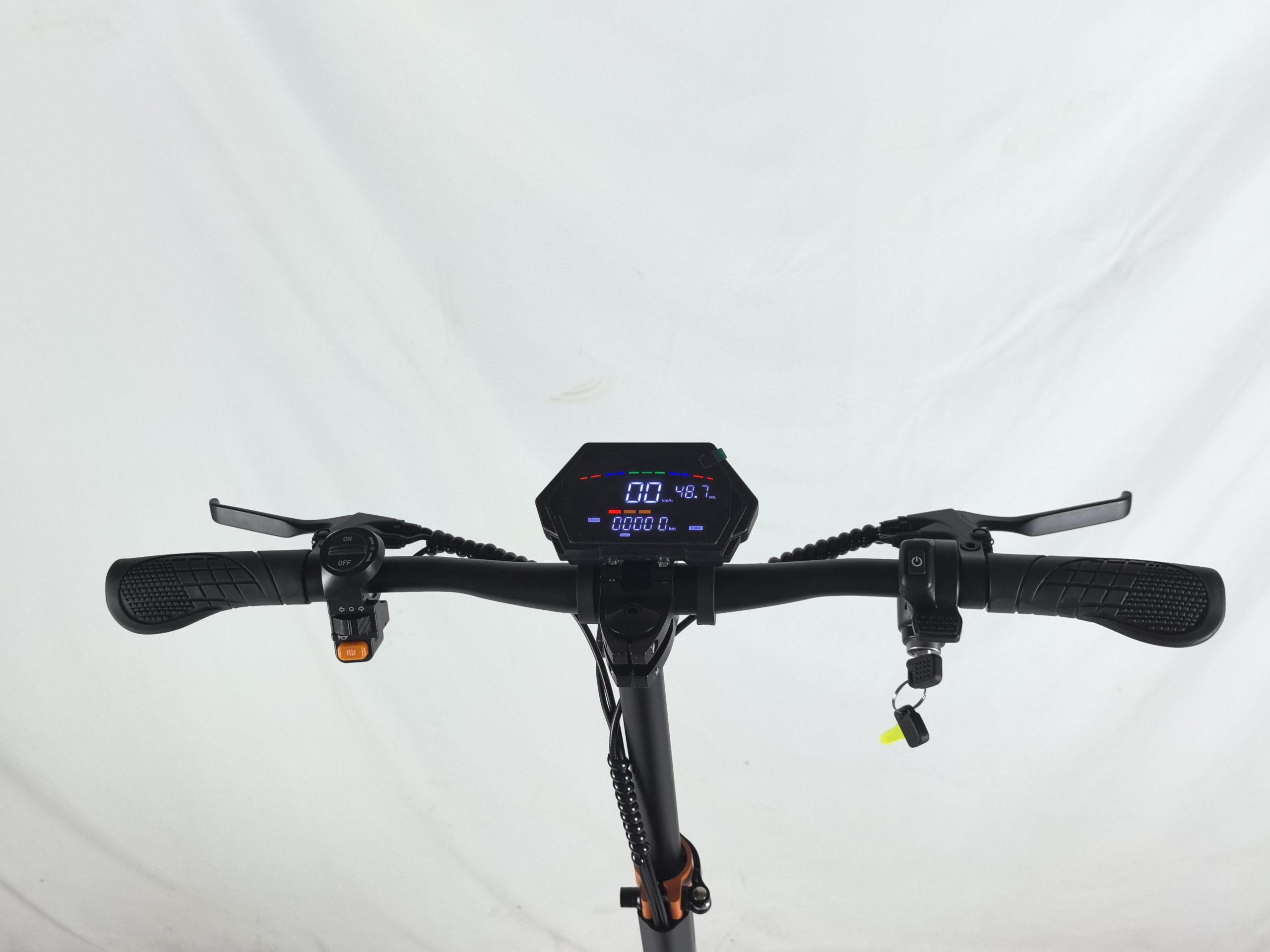 Электросамокат MOTIKO G1 собран на прочной железной раме, которая выдерживает регулярные нагрузки и не боится вибраций от езды по неровным дорогам. Колёса диаметром 6.5 дюймов установлены как спереди, так и сзади, обеспечивая хорошую устойчивость и лёгкость управления в городских условиях. Передняя вилка выполнена монолитной и дополнена двухсторонней амортизацией, которая эффективно гасит толчки от стыков асфальта, рельсов и небольших ям, делая каждую поездку заметно комфортнее. На руле расположен информативный ЖК-дисплей, показывающий скорость, уровень заряда батареи и другие важные параметры, чтобы вы всегда были в курсе состояния самоката.