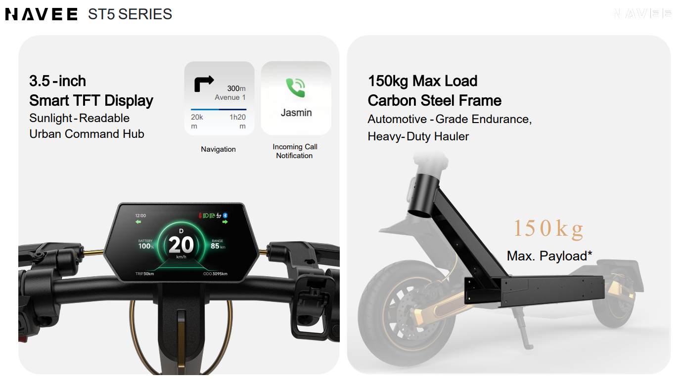 Передний и задний амортизаторы в сочетании с системой подвески обеспечивают высокий уровень комфорта при движении по любым дорожным покрытиям. Navee ST5 Pro сочетает в себе мощность, надежную защиту от влаги и интеллектуальные функции для комфортных городских поездок.