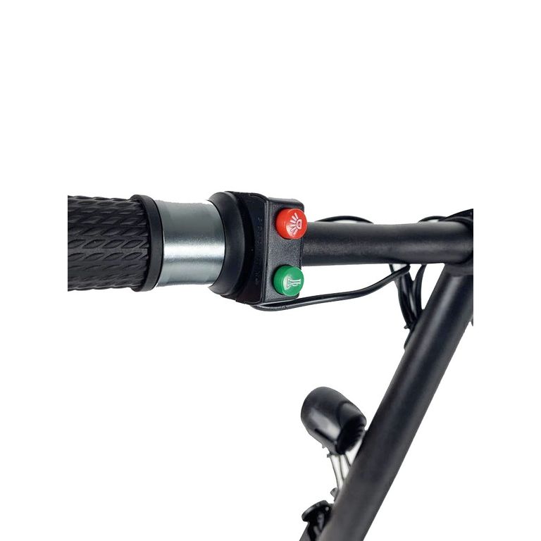 Электросамокат предлагает множество удобных функций, таких как ручка газа, напоминающая мотоциклетную, и резиновые ручки с рельефом для лучшего сцепления. Информативный дисплей отображает важную информацию о скорости и уровне заряда аккумулятора, а управление фонарем и подсветкой удобно расположено на руле, что делает его доступным для пользователя.