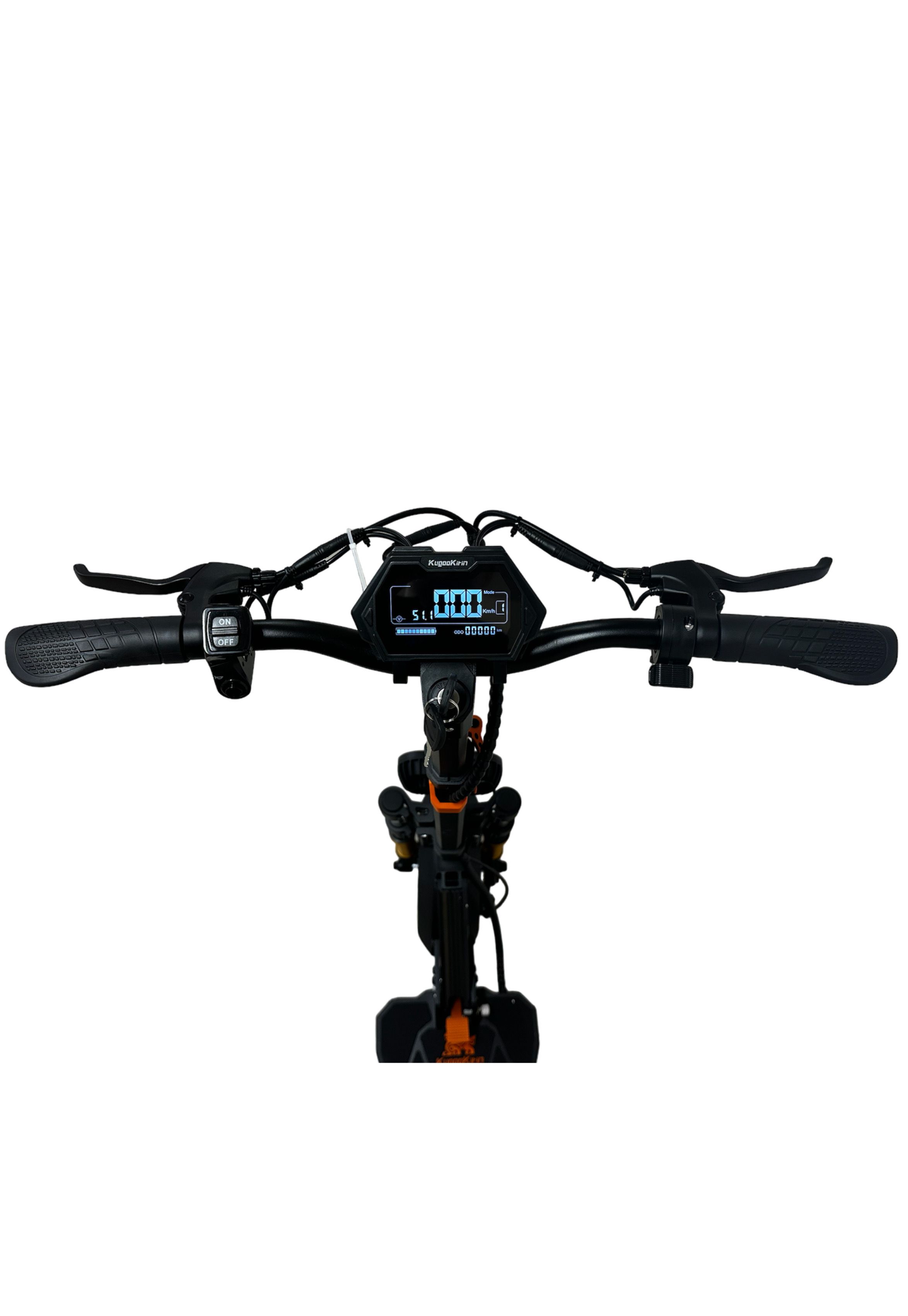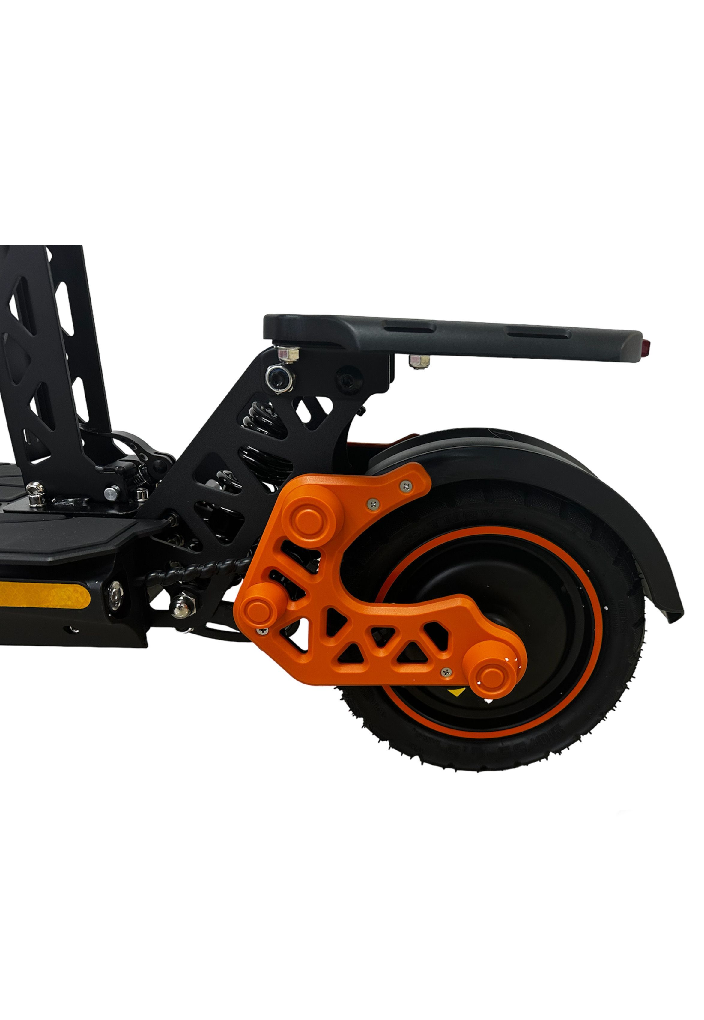 Весит 37,5 кг. Надувные колёса 11 дюймов спереди и 10 дюймов сзади — мягче едут по неровностям, чем литые. Передняя и задняя подвеска. Механические дисковые тормоза, привод задний. Складной руль и стойка — умещается в багажник.