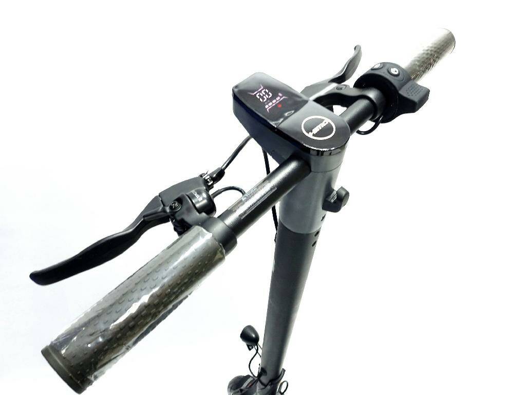 Рукоятки выполнены из прочного прорезиненного материала, поэтому обеспечивается удобная хватка рук. В центральной части руля располагается LED-дисплей, где отображаются основные данные: о выбранном режиме, скорости передвижения, уровне заряда аккумулятора и пр. Цифры отлично просматриваются при любом освещении, яркость остается на достойном уровне даже при попадании прямых солнечных лучей.