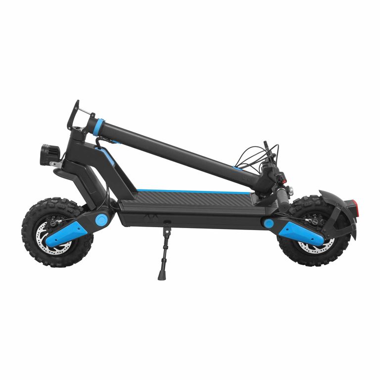 - Система складывания реализована при помощи специального рычага у начала рулевой стойки. Для того, чтобы придать самокату компактный вид, потребуется всего пара секунд – достаточно отодвинуть рычаг и сложить рулевую колонку, закрепив её за задний упор для ног. В сложенном виде самокат не займёт много места, его можно без проблем положить в багажник автомобиля.