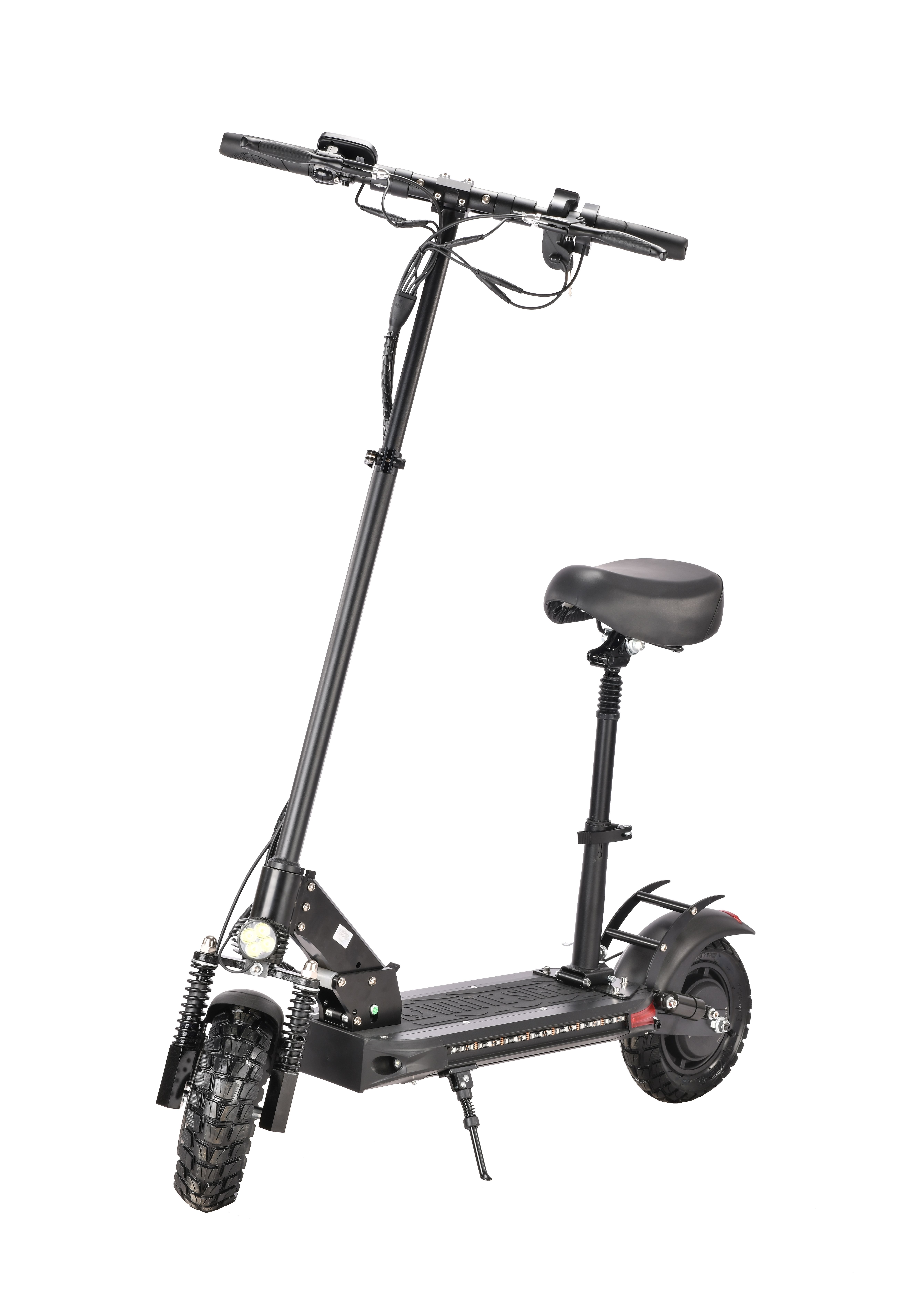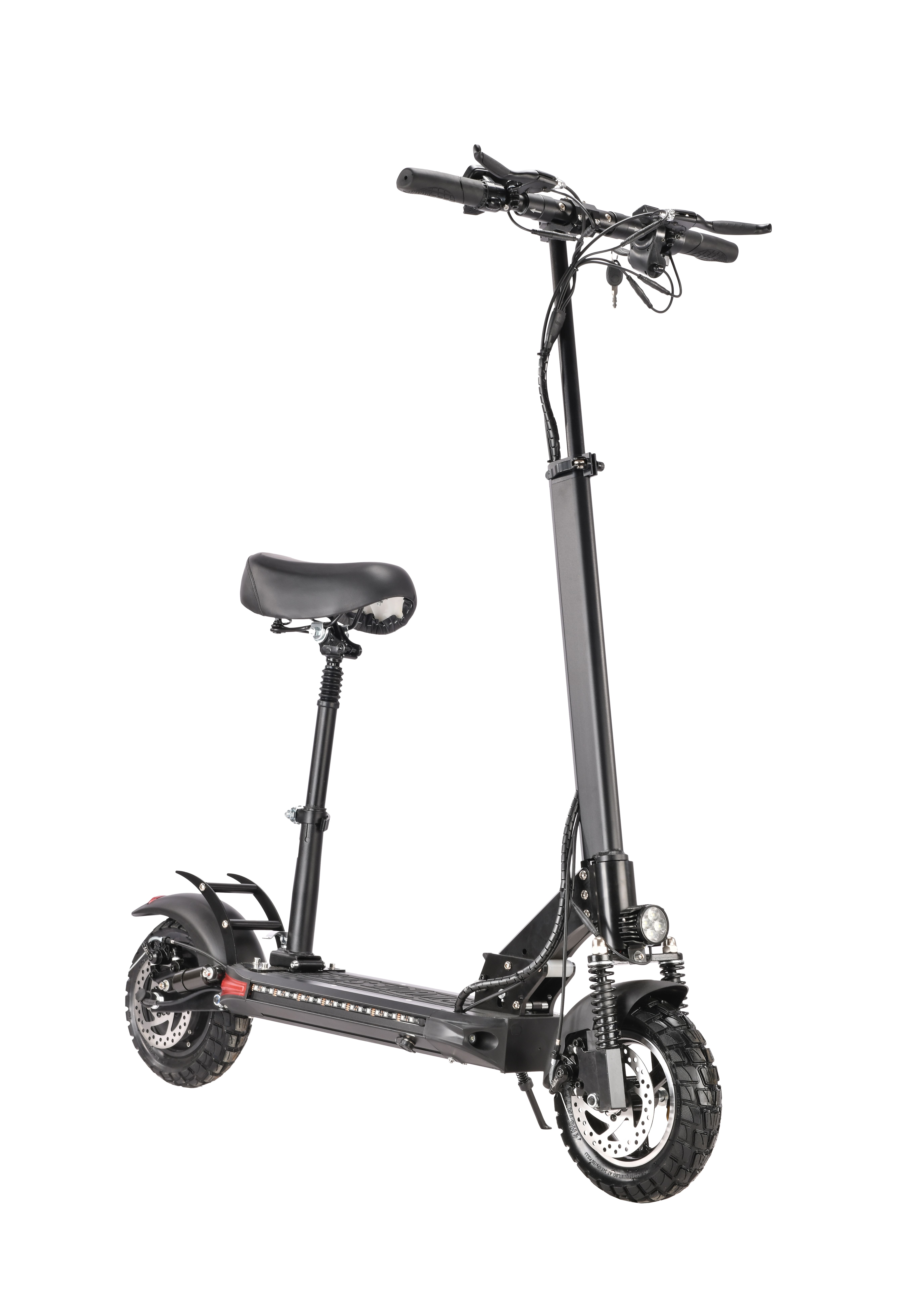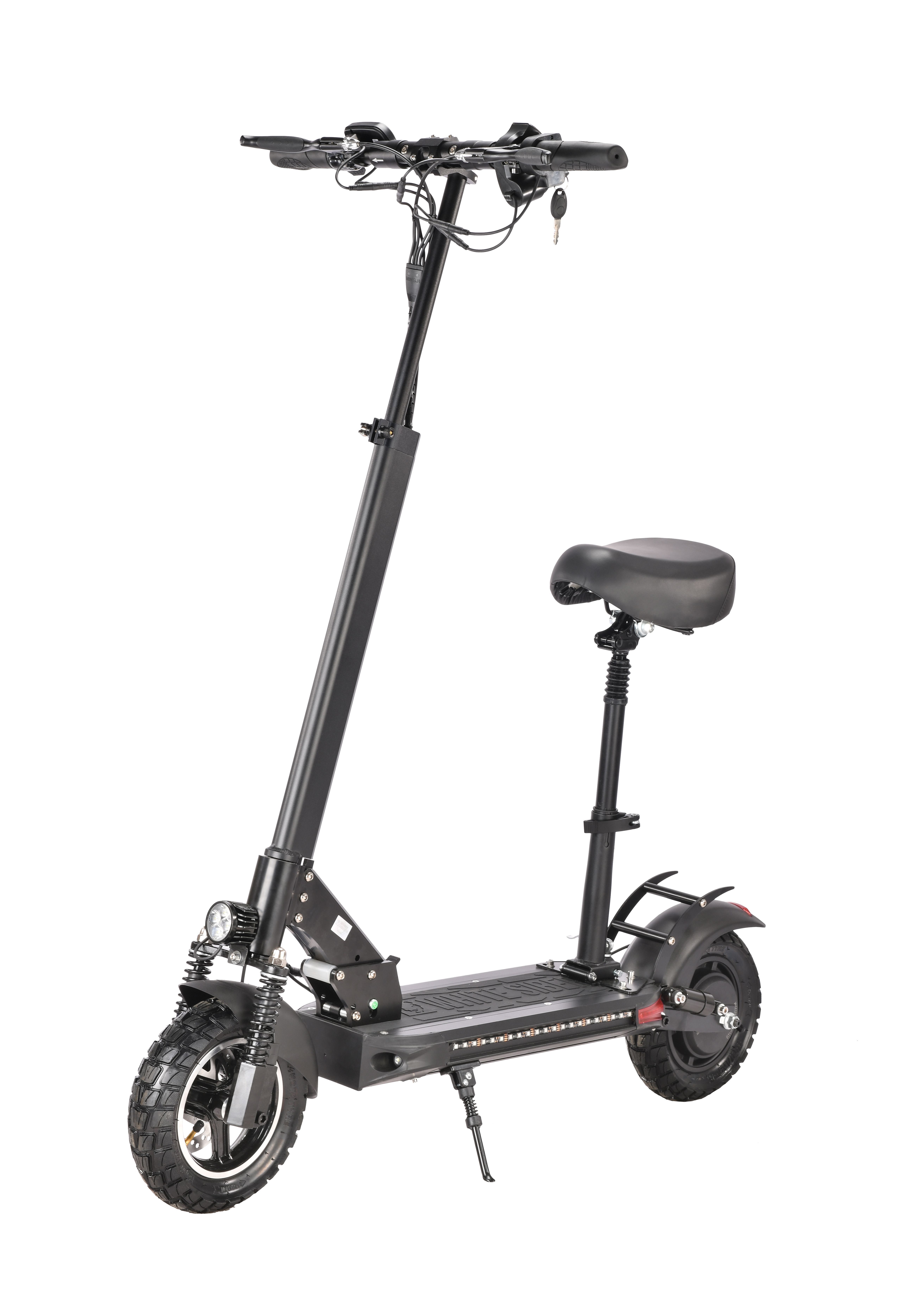 Управление данным транспортом максимально комфортное, благодаря анатомическим грипсам на руле и большому многофункциональному дисплею с «лепестком». На нем отображается текущая скорость и заряд аккумулятора. Показателями можно управлять в процессе движения. Управление газом самоката с помощью «лепестка» безопасно, по сравнению с курком газа. Так же самокат имеет большое сиденье + внутрение амортизаторы сиденья, по сравнению с конкурентами. Что дает ему дополнительный комфорт.