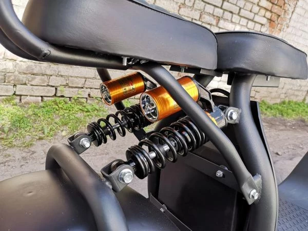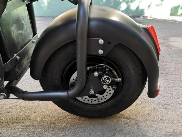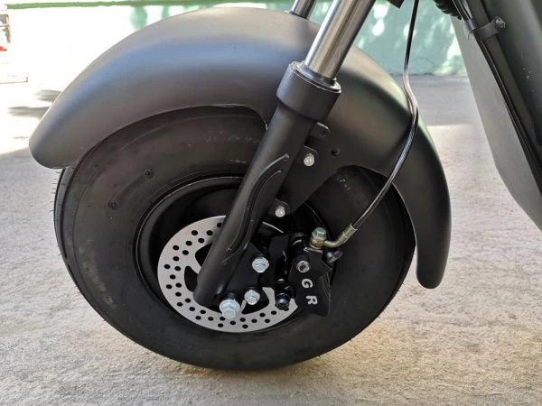 Электроскутер оснащен дисковыми гидравлическими тормозами, которые обеспечивают надежное и эффективное торможение, что особенно важно в условиях городского движения. Задний привод улучшает управляемость, а амортизаторы как передние, так и задние обеспечивают плавную езду даже по неровным дорогам.