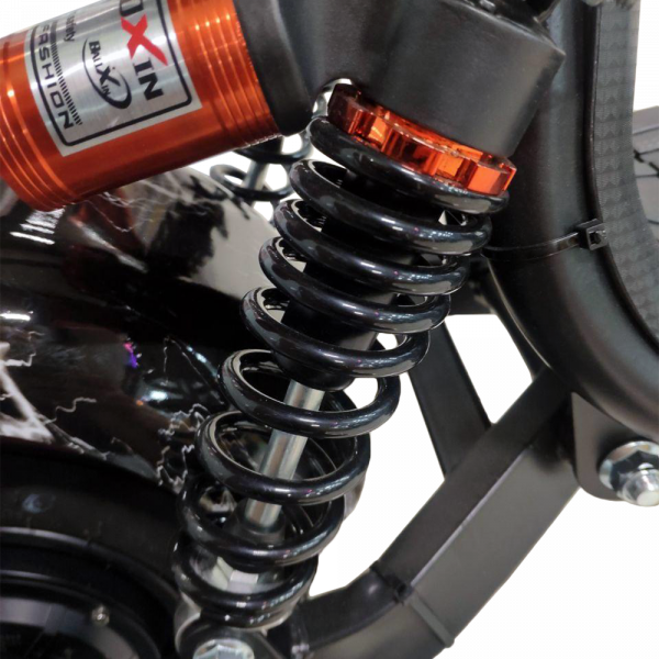 Катание будет комфортным, даже если вы решите выехать за пределы города. На дачу или рыбалку, например. Все благодаря широким надувным колесам и мощной системе амортизации электроскутера MiniPro. Она состоит из двух пружин сзади и мотоциклетной вилки спереди. Такое сочетание делает самую ухабистую дорогу мягкой и плавной для обоих райдеров.