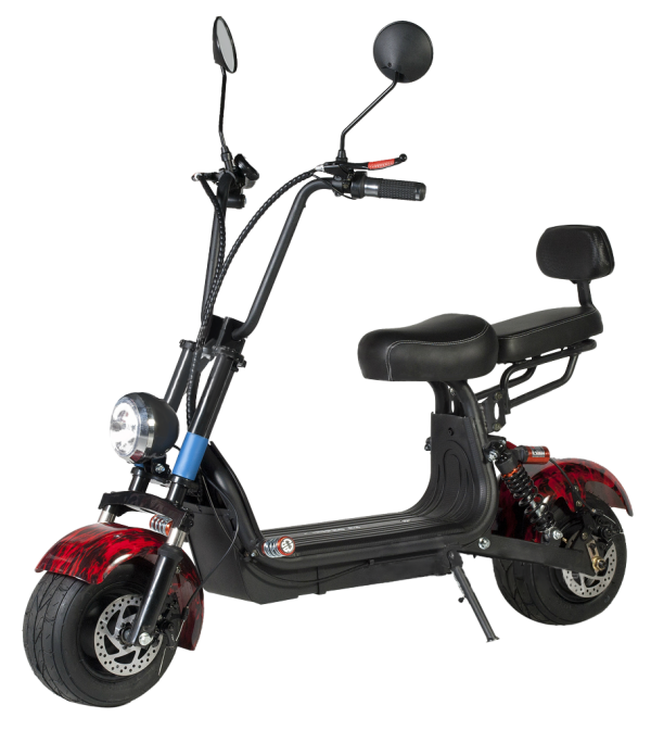 - Для поездок вдвоем есть двойное сиденье: кататься можно с другом, ребенком или второй половинкой. Да-да! Несмотря на свою компактность, мини-транспорт подходит для катания вдвоем. Все благодаря прочной раме электроскутера, которая сделана из алюминия. Она запросто выдерживает до 120 килограммов нагрузки, поэтому может уместить на себе еще одного пассажира. Для него, кстати, есть удобная спинка и подножки.