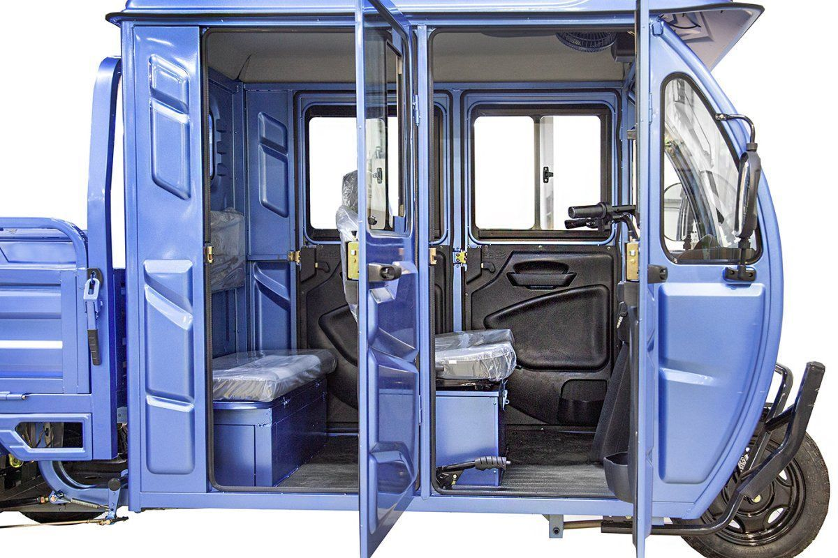 Электротрицикл Rutrike Рейс предлагает комфортабельную кабину, в которой могут разместиться до трех человек. Угол наклона руля можно регулировать, что позволяет каждому водителю настроить его под свои предпочтения. Освещение спереди и сзади обеспечивает безопасность в темное время суток.