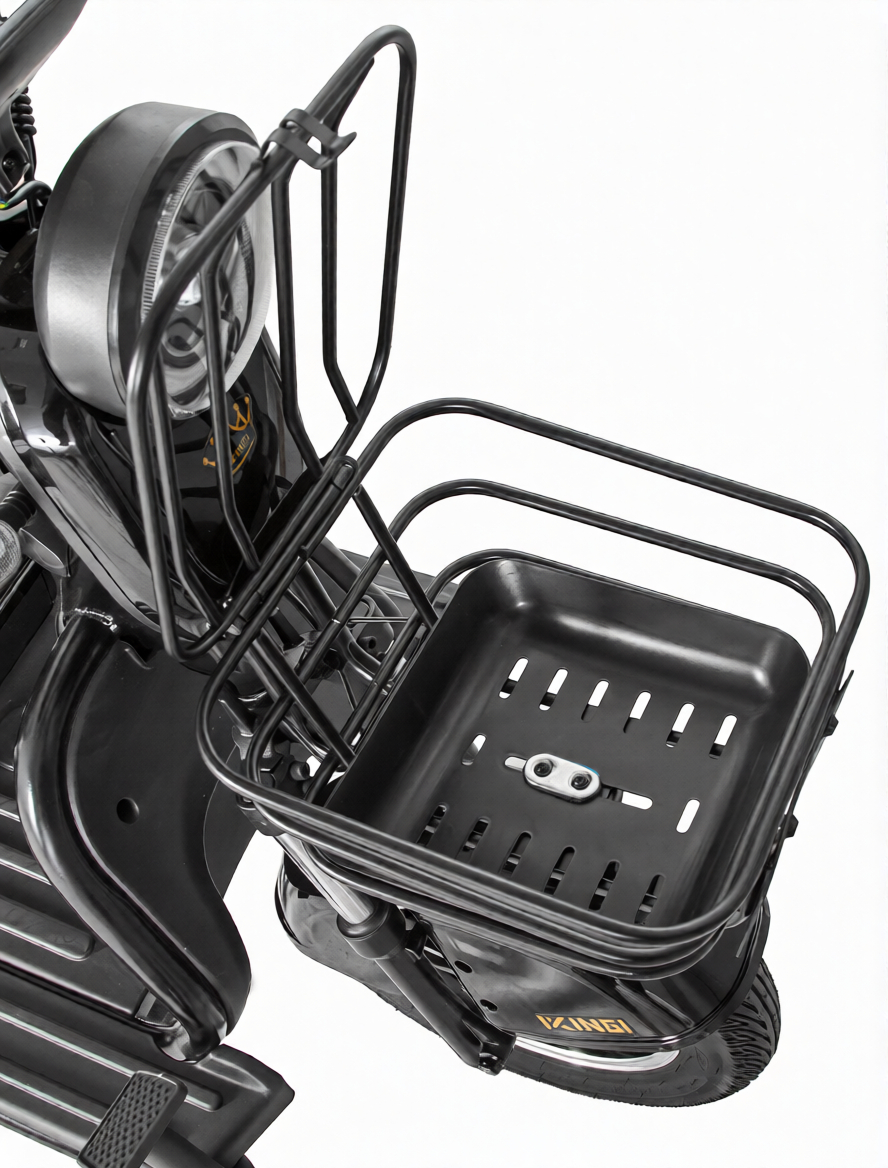 Электроскутер выполнен из прочной стальной рамы, что обеспечивает его долговечность и надежность. Цифровой бортовой компьютер предоставляет пользователю всю необходимую информацию, такую как скорость, уровень заряда, пробег и вольтаж аккумулятора, что делает управление более информативным и удобным. Съемный аккумулятор позволяет легко заменять его при необходимости, что добавляет удобства в использовании.