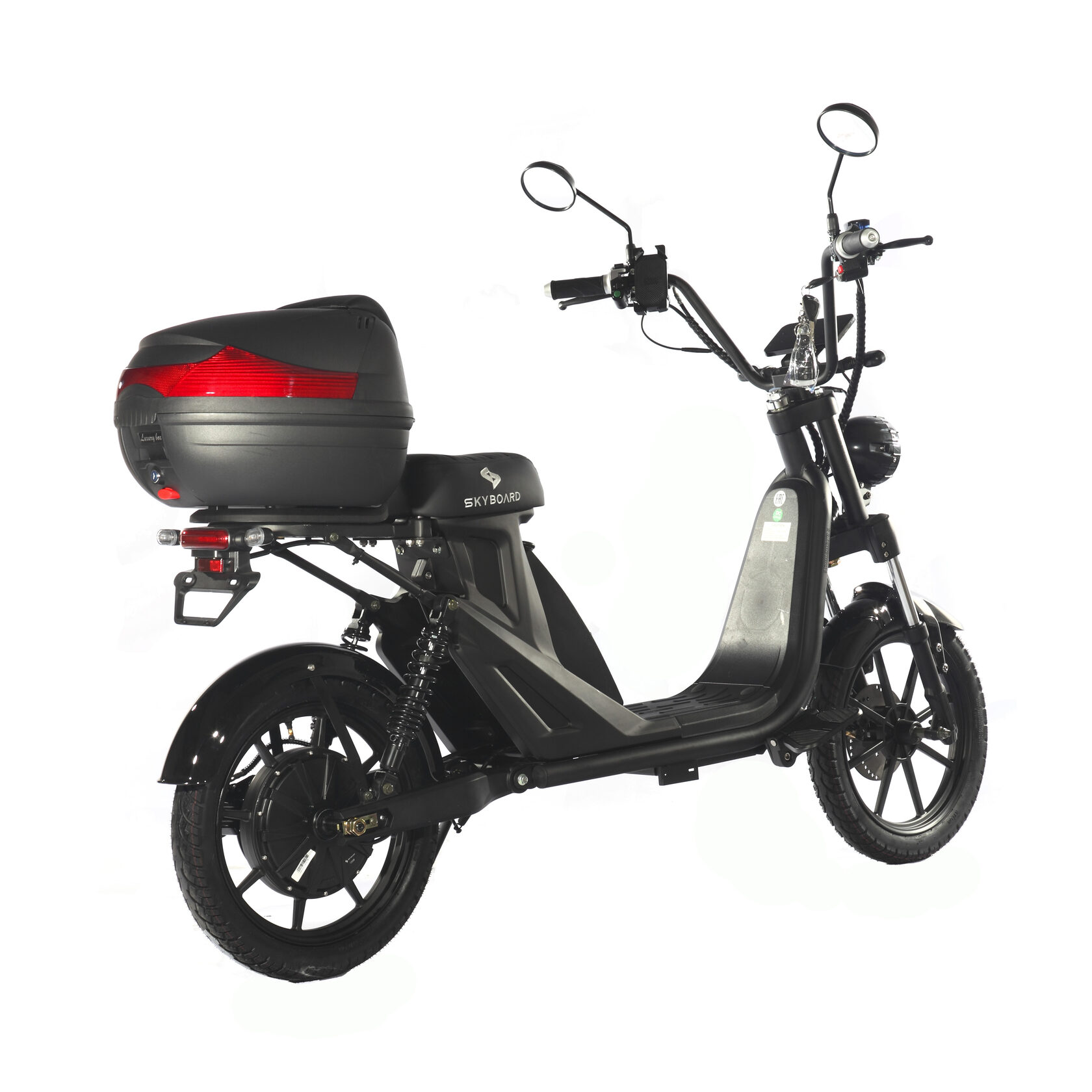 Электроскутер оборудован 14-дюймовыми передними и задними дисками, которые обеспечивают отличное сцепление с дорогой. Бескамерные надувные колеса и шоссейные покрышки гарантируют комфортную поездку даже на неровных поверхностях, а прочная рама из алюминия и стали с электрофорезным покрытием обеспечивает долговечность и надежность.