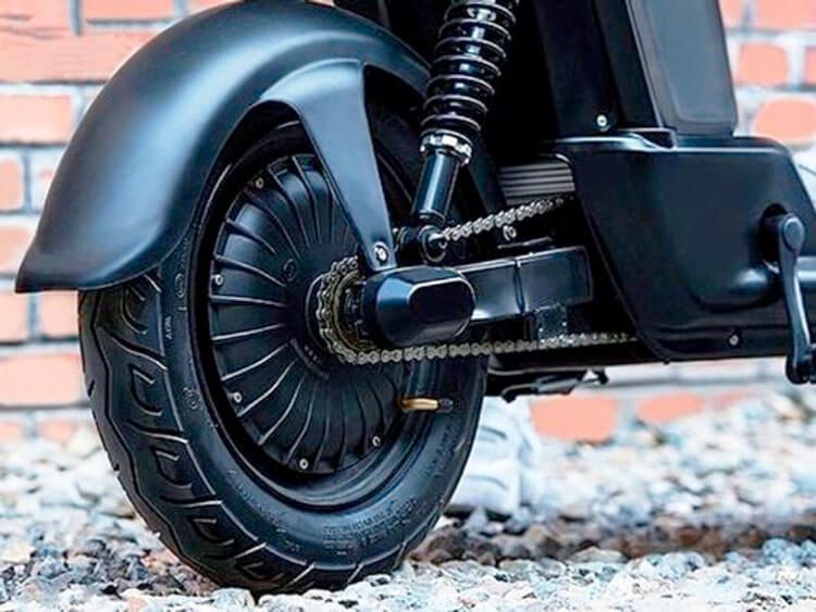 Удобное мягкое сиденье и достаточный простор для размещения ног. Рулевое управление удобное и легкое. Поезжайте с комфортом. Установлены надежные дисковые тормоза и отличная защита от влаги – вы не зависите от погодных условий. Комфортные гидравлические амортизаторы в сумме с пружинами позволят вам забыть о всех неровностях дороги. Двигатель расположен в заднем колесе что позволило сохранить классическую компоновку как у бензиновых скутеров.