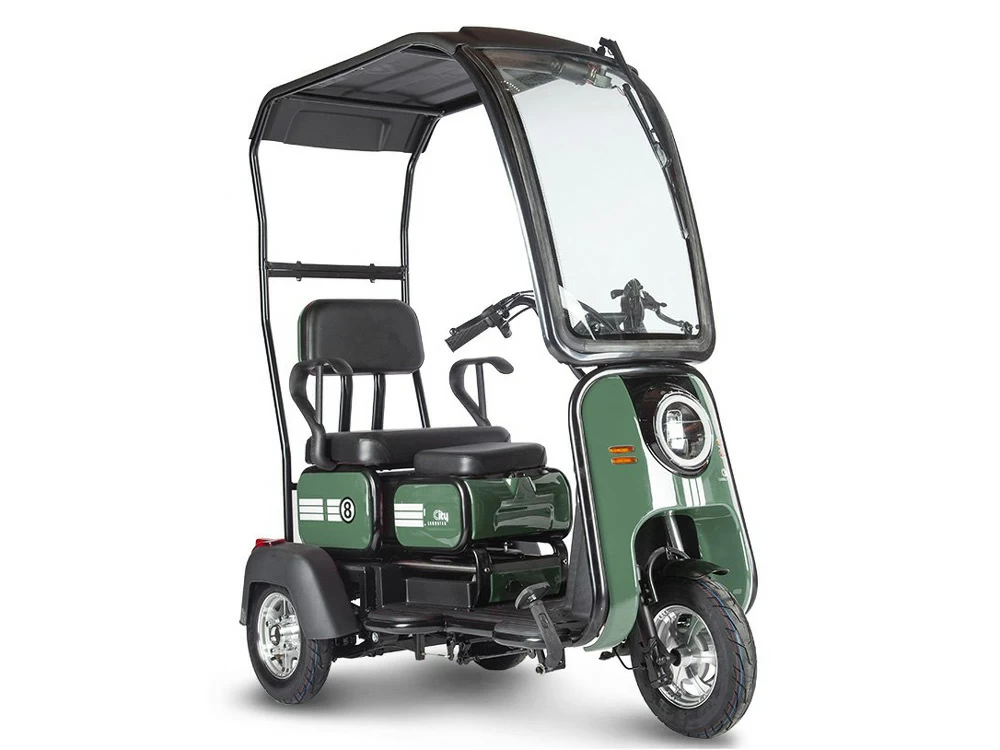 Этот компактный и юркий трёхколёсный электроскутер прекрасно подойдёт как для частного, так и для коммерческого использования. Наличие крыши с большим обзорным лобовым стеклом и стеклоочиститель расширяют сферу применения новинки.
