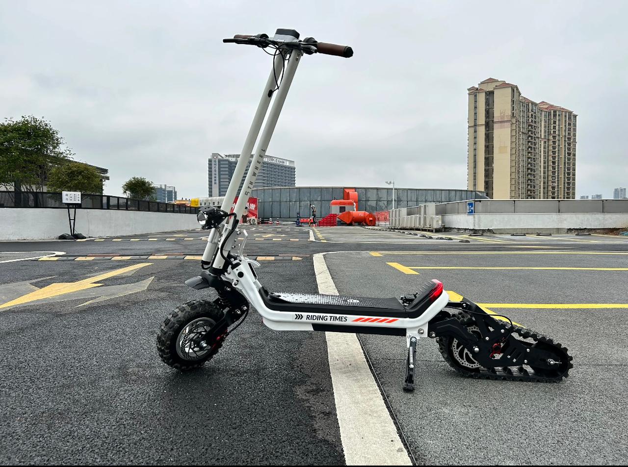 Внедорожный самокат оснащен передними и задними гидравлическими тормозами, обеспечивающими экстренное торможение на асфальте, грязи, снегу.