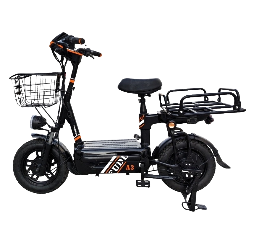 Электровелосипед FUDUDU A3 выполнен на стальной раме черно-оранжевого цвета, способной выдерживать максимальную нагрузку до 200 кг. Это позволяет комфортно перевозить двух взрослых человек или водителя с тяжелым грузом. Литые колеса диаметром 16 дюймов исключают риск проколов и не требуют регулярной подкачки, что особенно важно при интенсивной эксплуатации.