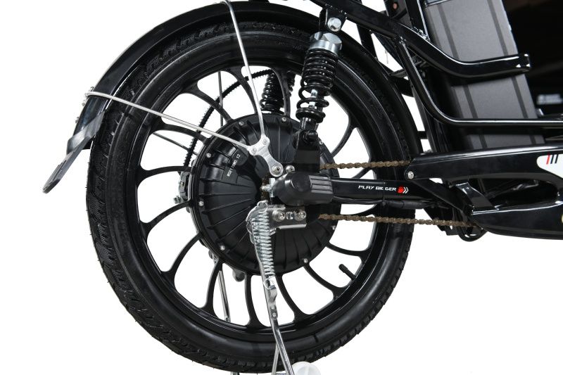 Дополнительным плюсом является гидравлическая система торможения заднего колеса. Это мощная мотоциклетная тормозная система, сможет остановить ваш велосипед в любой момент, даже в загруженном состоянии. Так же спереди имеются барабанные тормоза, одни из самых неприхотливых тормозов на рынке велосипедов. Электро мотор на данной модели имеет мощность 1500 Вт и относится к тяговому типу двигателей. Новая версия, в отличие от старой,имеет сертификат ECC (европейский стандарт). Максимальная скорость составляет 24 км/ч, в зависимости от веса райдера, рельефа и погодных условий.