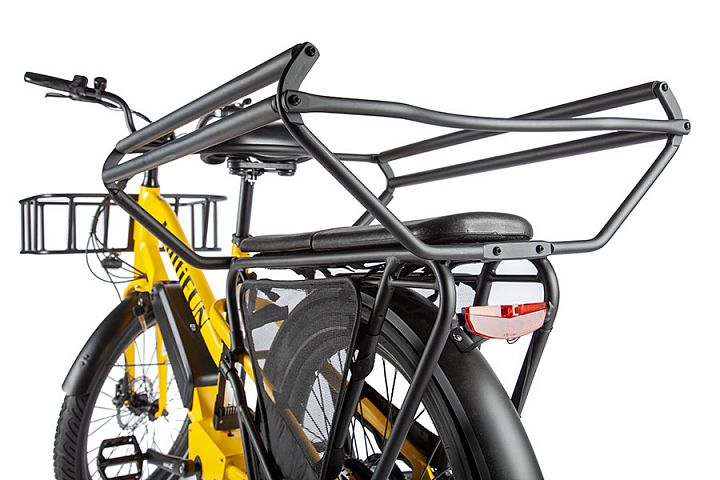 Модель оснащена двумя аккумуляторными батареями по 10,4 Ач, что в сумме предоставляет запас хода до 100 км без подзарядки. Огромный трансформирующийся багажник позволяет перевозить грузы и пассажиров, практичности также добавляет большая прочная металлическая передняя корзина. Грузоподъёмность модели — 130 кг. Этот электровелосипед — настоящий рекордсмен по перевозкам и прекрасно подойдёт как для частного использования, так и для курьерских, транспортных, коммунальных служб.