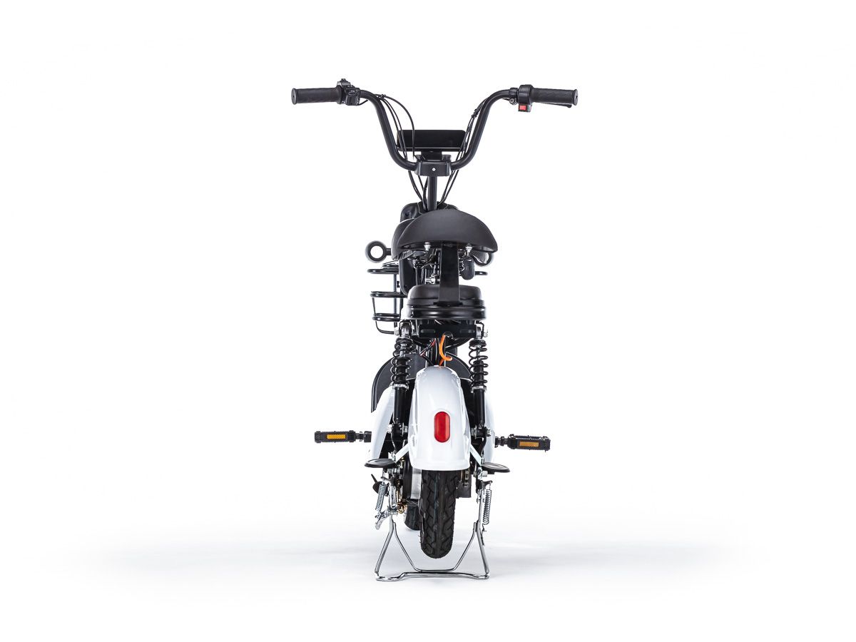 Это современный электромопед с бесщеточным двигателем мощностью 500(250) ватт. Может проехать в смешанном режиме до 35 км, а в идеальных условиях — до 70 км.