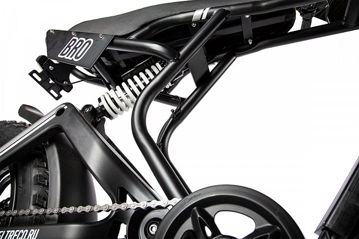 Мощный редукторный электромотор 500 ватт, большой аккумулятор с напряжением 48 вольт и ёмкостью 15 ампер-часов обеспечат солидный запас мощности и дальность пробега до 50 километров даже в условиях поездок по пересечённой местности и сложному грунту. Этому способствуют и широкие покрышки фэтбайка с ярко выраженным протектором, а также настраиваемый амортизатор заднего маятника, который отлично отрабатывает при езде по неровностям.