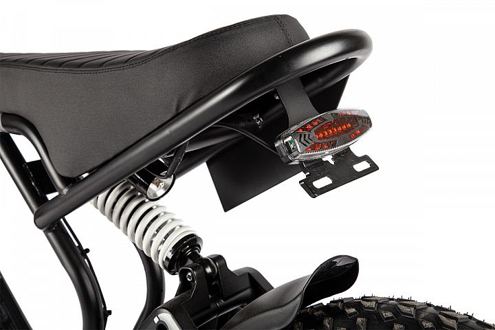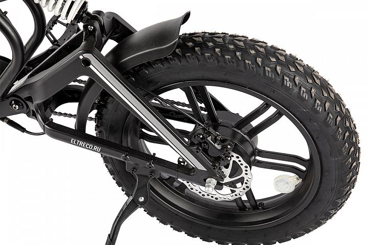 Мощный редукторный электромотор 750 ватт, большой аккумулятор с напряжением 48 вольт и ёмкостью 15 ампер-часов обеспечат солидный запас мощности и дальность пробега до 50 километров даже в условиях поездок по пересечённой местности и сложному грунту. Этому способствуют и широкие покрышки фэтбайка с ярковыраженным протектором, а также настраиваемый амортизатор заднего маятника, который отлично отрабатывает при езде по неровностям.