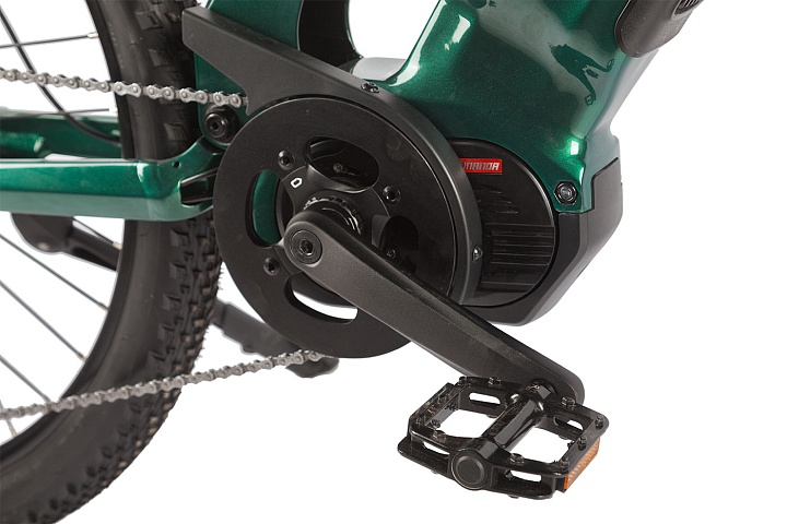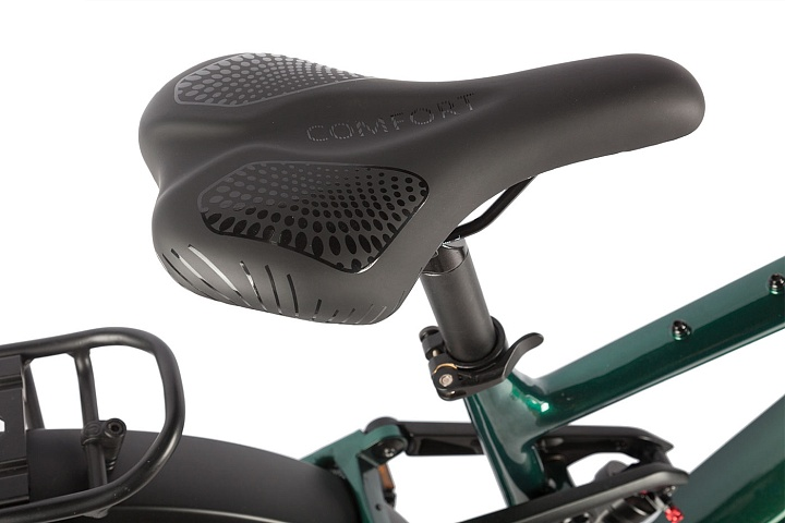 Кареточный привод и редукторный мотор обеспечивают плавный и мощный разгон, а дисковые гидравлические тормоза диаметром 180 мм гарантируют надежное торможение в любых условиях. Двухподвесная подвеска повышает комфорт при поездках по неровным маршрутам.