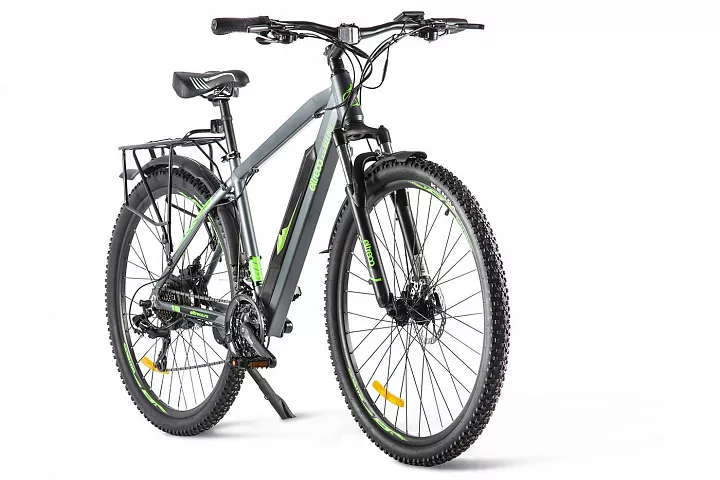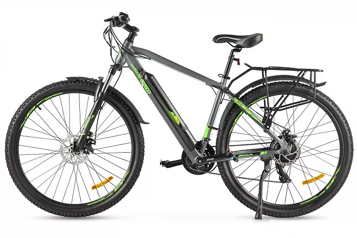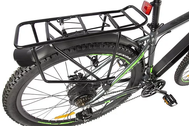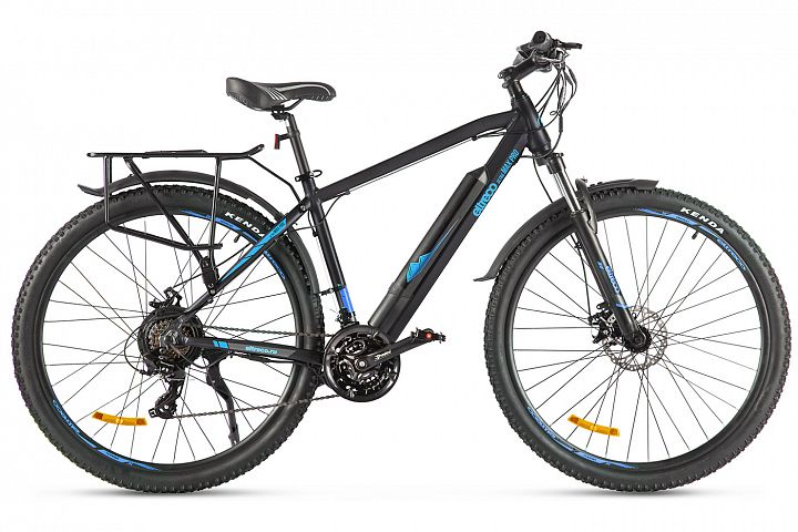 У новой топовой модели от Eltreco лёгкая алюминиевая рама с интегрированной съёмной батареей (улучшенная развесовка по сравнению со старой моделью), большие колёса 29" и покрышки Kenda с универсальным протектором, 21 скорость от Shimano, пружинно-эластомерные амортизационная вилка с блокировкой, надёжный электромотор 500 Ватт и максимальная ёмкость аккумуляторной батареи, позволяющих преодолевать большие расстояния без подзарядки! В комплектацию модели входят крылья и прочный металлический задний багажник.