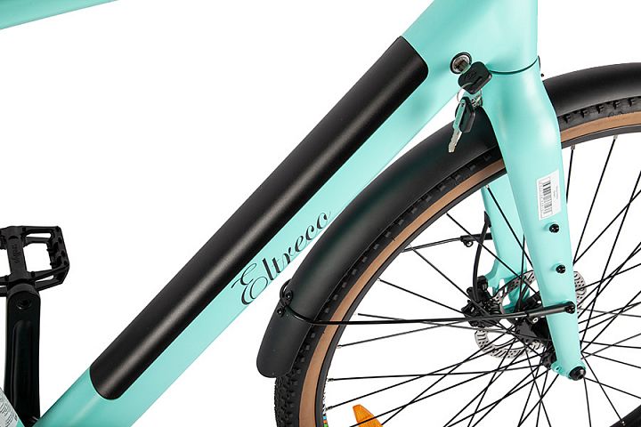 На передней вилке сбоку расположены отверстия с болтами для крепления фляги, что также не портит дизайн, но полностью соответствует дорожной философии этого электровелосипеда.