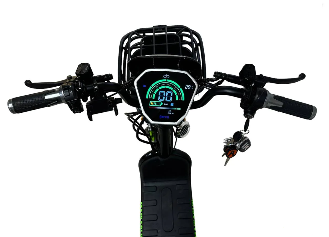 Электровелосипед Monster Maikaolin H10 40AH 60V выполнен в черном цвете на нескладной раме, что обеспечивает максимальную жесткость и надежность при ежедневных городских поездках. Вес устройства составляет 52 кг, что характерно для мощных моделей с высокоемкой аккумуляторной батареей и литыми колесами. Вместительная корзина, установленная на руле, позволяет перевозить покупки, сумки или другие личные вещи без использования дополнительных аксессуаров.