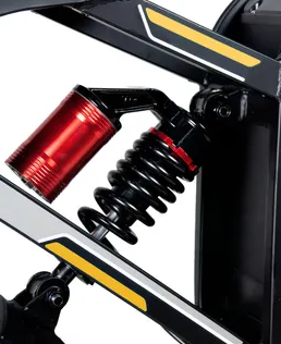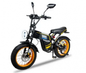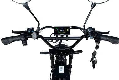 Электровелосипед оснащен подседельным амортизатором и пружинно-эластомерной вилкой, что улучшает комфорт при езде по неровным поверхностям. Половинчатая ручка газа делает управление более интуитивным, а наличие зеркал заднего вида и мощной фары повышает безопасность при передвижении по городским улицам.