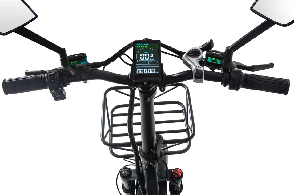 Электровелосипед оборудован дисковыми механическими тормозами как спереди, так и сзади, что обеспечивает надежное и безопасное торможение. Это особенно актуально при высоких скоростях и в условиях городской среды. Дисплей, расположенный на руле, предоставляет информацию о скорости, уровне заряда аккумулятора и других важных параметрах, что делает каждую поездку более информативной и безопасной.
