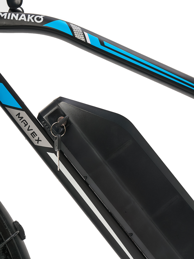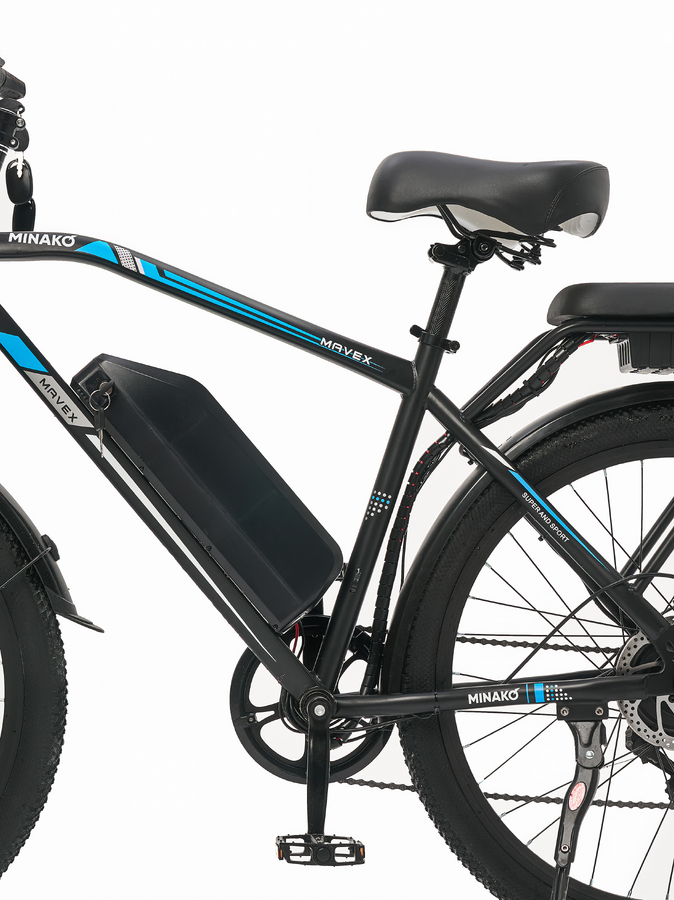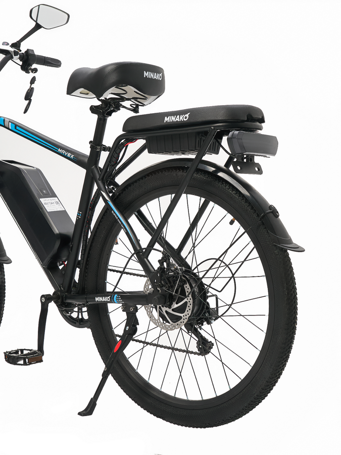 Электровелосипед Minako Mavex также оснащен сигнализацией, что повышает уровень безопасности при стоянке. Мягкий багажник позволяет удобно размещать личные вещи, а задние поворотники обеспечивают дополнительную видимость на дороге, особенно в темное время суток.