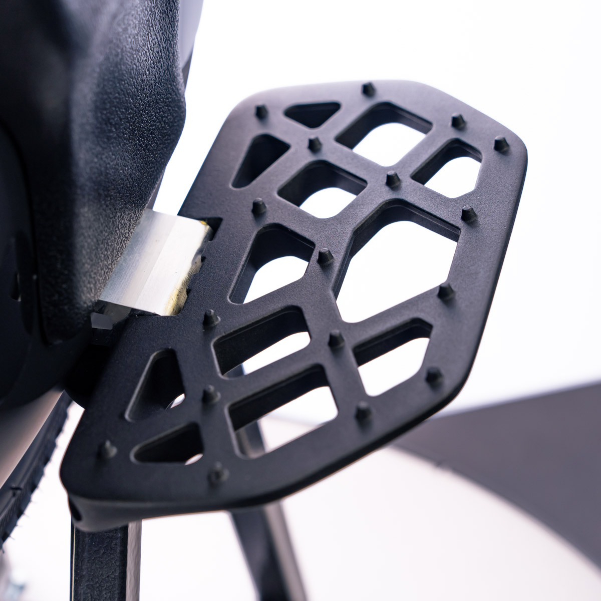 - Алюминиевые подножки с прорезиненным покрытием и боковые подушечки на корпусе обеспечивают комфорт во время езды на моноколесе. Для большей компактности во время транспортировки подножки складываются.
