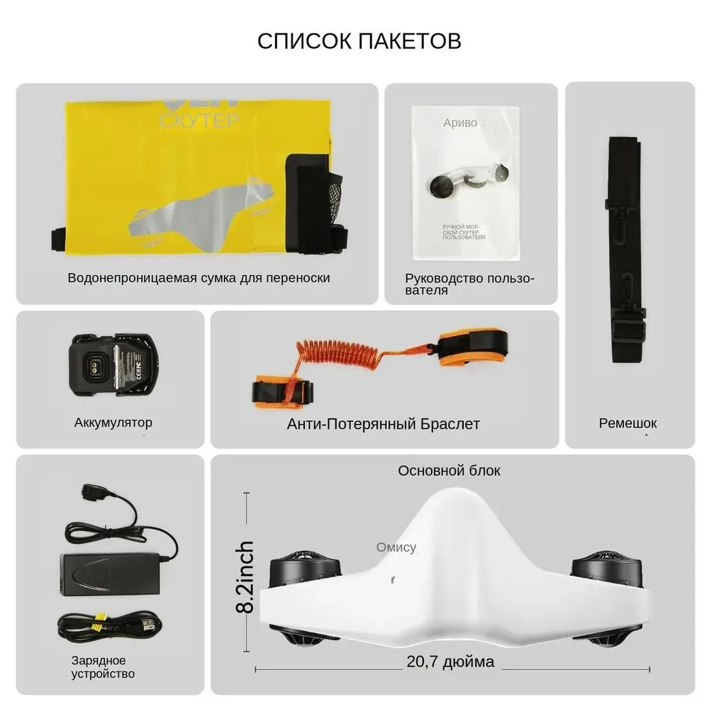 Скутер оснащен Li-ion аккумулятором 25.2V 5А 5000 мАч, который обеспечивает мощность 126 Вт/ч и подходит для перевозки в самолете. Время зарядки составляет всего 2-3 часа, что делает его удобным для использования в поездках. Устойчивые к коррозии материалы конструкции гарантируют долговечность и надежность скутера в условиях подводной среды.
